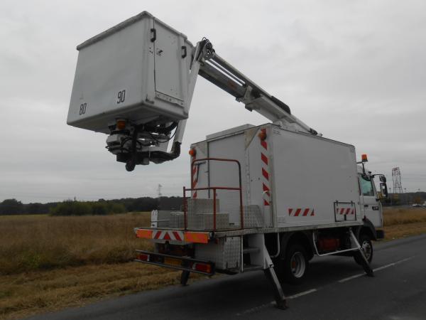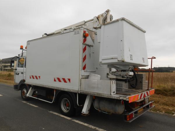 NACELLE COMILEV-SODALEM EN 150 TPC à bras télescopique et pendulaire – Hauteur de travail maxi 15 m. / portée 8 m. - Panier fibre 265kg - 4 béquilles stabilisatrices - Compartiment FOURGON à ouverture arrière avec aménagement étagères, établi bois et armoire métallique - Cabine 2 places - Gyrophare + tri flash - Boite de vitesse manuelle 6 rapports avants - Suspension mécanique - Réservoir GO acier 130 litres - Pneus 215/75R7.5 a 50% d'usure - Véhicule fonctionnel / entretien suivi - 7770 heures - Contrôle technique périmé (A3434)