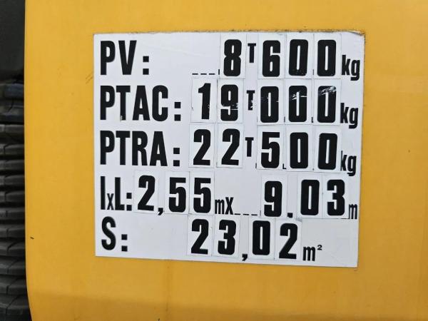 Essieu arrière: Charge maximale sur essieu: 9000 kg; Sculptures des pneus gauche: 90%; Sculptures des pneus droite: 90%; Freins: freins à tambour; Suspension: suspension pneumatique