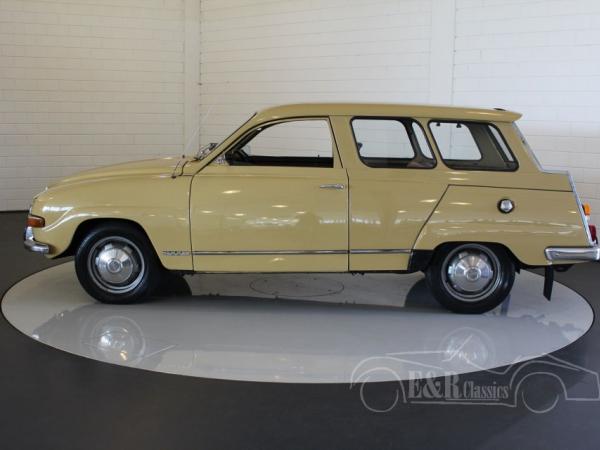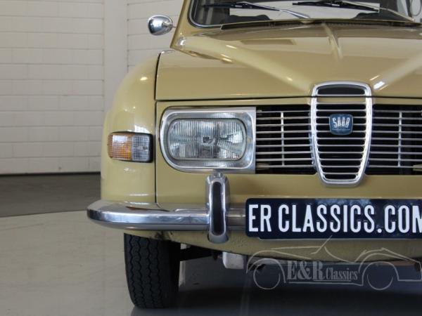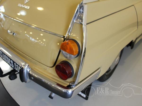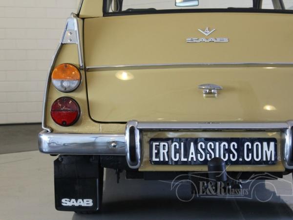 This Saab 95 Sporthatch was originally delivered in Holland in 1973 in beautiful beige (Y2) paint with several chrome details and the round taillights. The V4 engine was very well maintained and functions by the column shift. The interior has the original dashboard and the seat have brown leatherette and cloth upholstery. In the back there is the extra bench, so the car has 7 seats.
