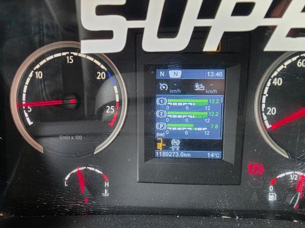 Essieu arrière 1: Roues jumelées; Charge maximale sur essieu: 11500 kg; Sculptures des pneus gauche interne: 90%; Sculptures des pneus gauche externe: 90%; Sculptures des pneus droit externe: 90%; Sculptures des pneus droit externe: 90%; Suspension: suspension pneumatique