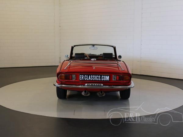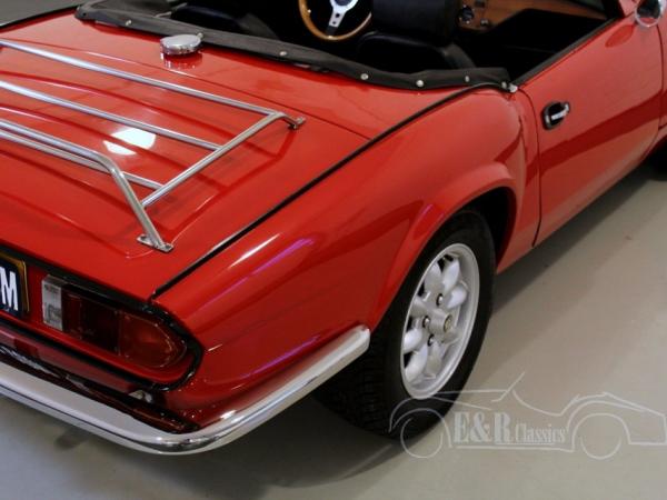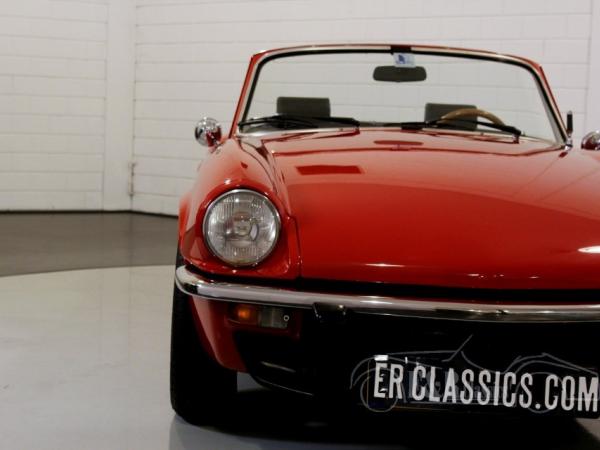 This is a beautiful 1978 Triumph Spitfire 1500 cabriolet. The car is in beautiful condition. This Triumph has red paint with a black leatherette interior. The car also has Minilite wheels, chrome luggage rack and a black soft top.