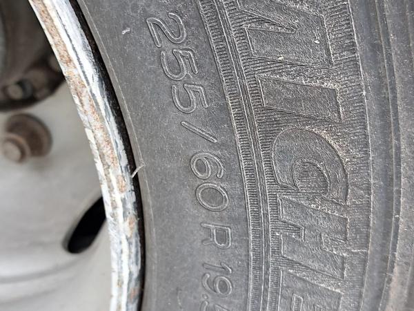 Achteras 1: Bandenmaat: 255/60r19.9; Dubbellucht; Bandenprofiel linksbinnen: 2 mm; Bandenprofiel linksbuiten: 2 mm; Bandenprofiel rechtsbinnen: 2 mm; Bandenprofiel rechtsbuiten: 2 mm
