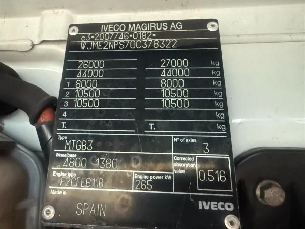 Achteras 1: Dubbellucht; Differentieelslot; Max. aslast: 10500 kg; Bandenprofiel linksbinnen: 30%; Bandenprofiel linksbuiten: 30%; Bandenprofiel rechtsbinnen: 30%; Bandenprofiel rechtsbuiten: 30%; Reductie: naafreductie