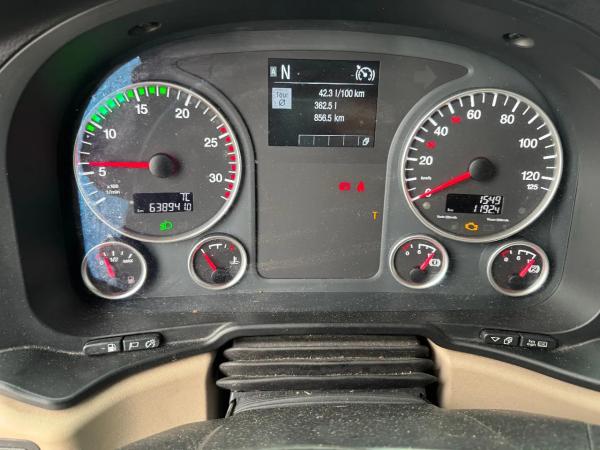 Achteras: Dubbellucht; Differentieelslot; Max. aslast: 11500 kg; Bandenprofiel linksbinnen: 70%; Bandenprofiel linksbuiten: 70%; Bandenprofiel rechtsbinnen: 70%; Bandenprofiel rechtsbuiten: 70%; Reductie: enkelvoudige reductie; Vering: luchtvering