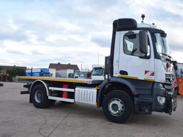 2dehands vrachtwagen Mercedes Arocs 1836 met platte bak – Slechts 32.000 km – inox Plateau +- 4.50 m – Sneeuwplaat – P.T.O aansluiting met Hydraulique ( motor of boite ) – Naafreductie – Airco – Camera – Bandenmaat 13R22.5 - total 19.000kg - tarra 8667 kg - tarra 3900 - wielbasis 3900 -