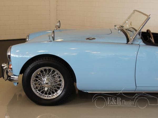 This is a 1961 MGA cabriolet in the marvellous colour Iris Blue. The car is in excellent restored condition and has become a 5-speed gearbox during the restoration. The car also has a new black leather interior and new chrome wire wheels.