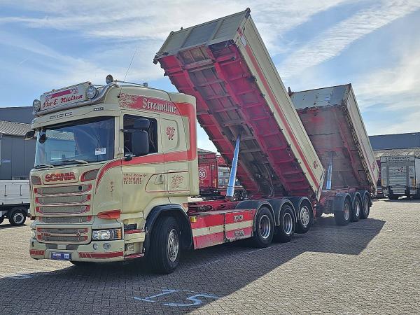 Aantal Assen: 4, Configuratie: 8x4, Eigen gewicht: 15675 kg, Totaalgewicht: 33000 kg, Diesel inhoud totaal: 400 liter, Aanhangwagen kopp., Dikte koppelingspen: Special, Schotel type: Fixed, Aantal sperren: 2, Vering type: vollucht, Soort cabine: Highline, Cruise control, Tachograaf, Digitale tachograaf, Airconditioning, Standkachel, Elektrische ramen, Elektrische spiegels, Radio/cassette, GPS navigatie, Kleur: Meerkleurig, Verwarmde spiegels, Achteruitrij camera, Soort lampen: Halogeen, Laneassist, Climatecontrol, Stoelverwarming, Bluetooth, Zwaailichten, Motorvermogen: 427 Kw (573 Hp), Brandstof: diesel, Euro: 6, Soort versnellingsbak: Opti-cruise, Merk versnellingsbak: Scania, Versnellingen: 12, Stuurbekrachtiging, ABS (Anti Blokkeer Systeem), ASR (Anti Slip Regeling), Hydraulische installatie, PTO, PTO soort: 1, Start accu, Aantal zijden: 2 zijdig kippend, systeemtype: ., Pomp, Centrale vergrendeling, Stoelopstelling: 1+1, Stoelbekleding: leder, Stoel verstelling: Handmatig