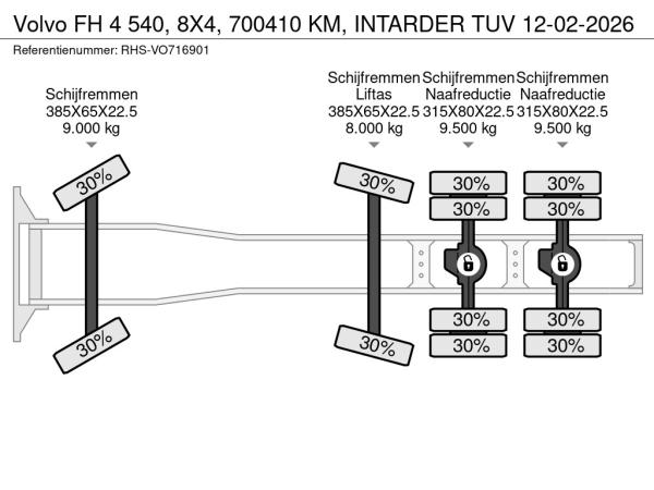 Vooras: Bandenmaat: 385X65X22.5; Max. aslast: 9000 kg; Meesturend; Bandenprofiel links: 30%; Bandenprofiel rechts: 30%