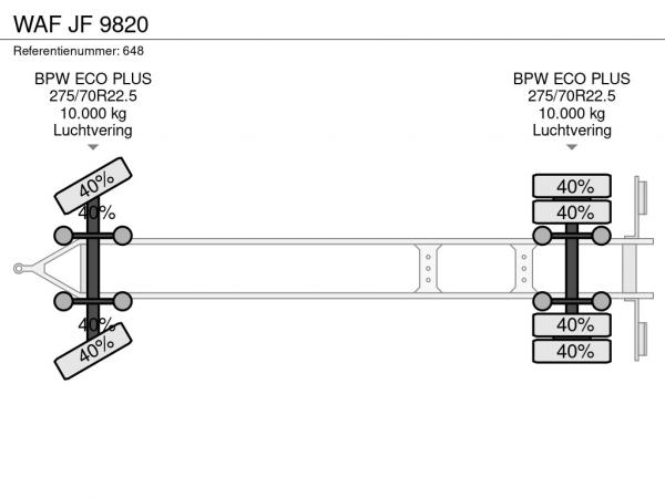Vooras: Dubbellucht; Max. aslast: 10000 kg; Meesturend; Bandenprofiel linksbinnen: 40%; Bandenprofiel linksbuiten: 40%; Bandenprofiel rechtsbinnen: 40%; Bandenprofiel rechtsbuiten: 40%