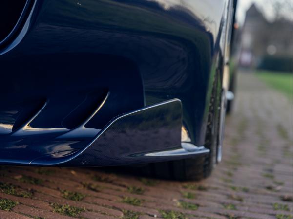 The exterior detailing is purposeful and restrained. Glossy Blue Carbon elements add depth rather than drama, while satin aluminium badges and scripts underscore the car’s motorsport intent. Subtle Scotland Blue accents on the bonnet and mirrors frame the design, and matt Racing Grey wheels paired with blue brake calipers ground the car visually. Leaving the engine bay carbon in its natural finish feels like a nod to authenticity; performance first, ornament second.