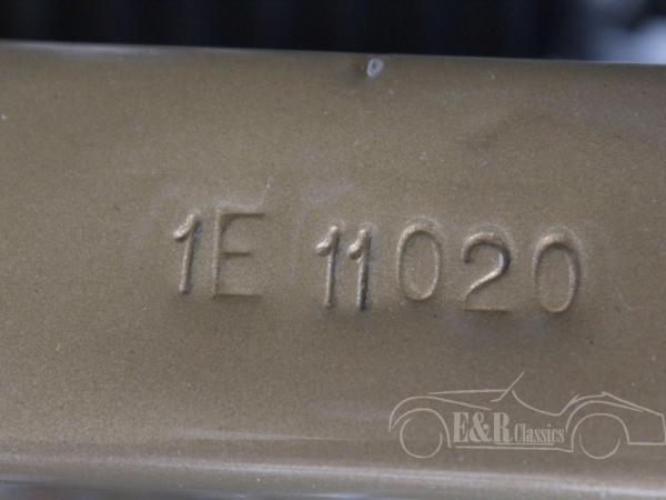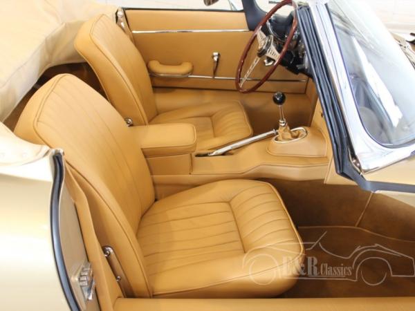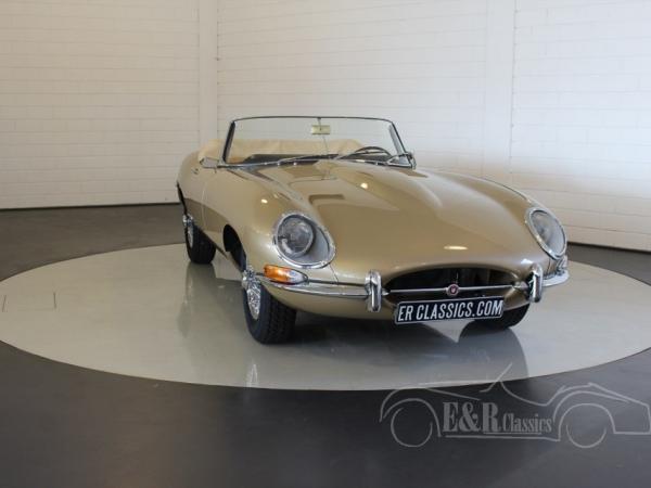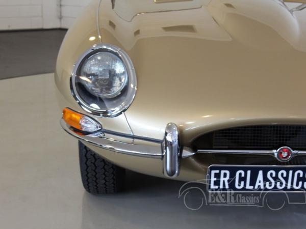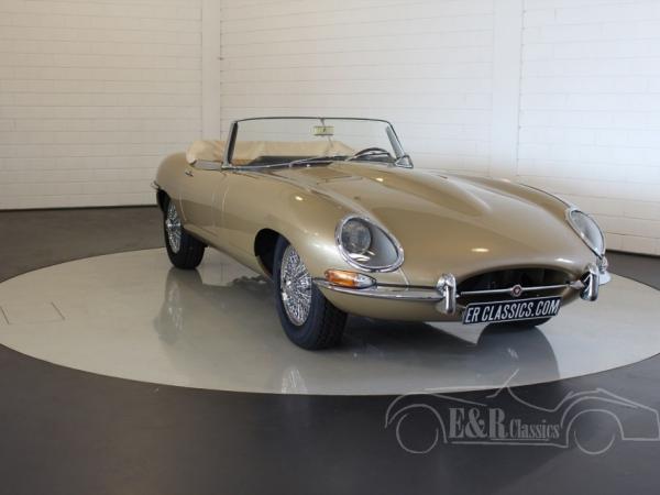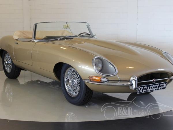 This Jaguar E-Type is fully restored in 2017 in our workshop. The Jaguar is provided with new Opalescent Golden Sand paint such as at the original delivery in 1965. The impressive interior has beige leather upholstery of the highest quality. The original matching numbers 4235 CC engine is fully revised. Full photoreport of the restoration is present. The Jaguar Heritage Certificate is present too.