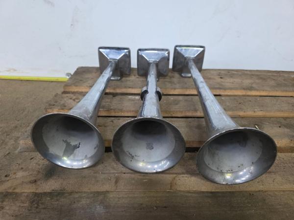 Set of 3 air horns Suitable for truck, trailer or vehicles Powerful sound Robust design Metal construction Easy to assemble Used condition Ideal for replacement or upgrade