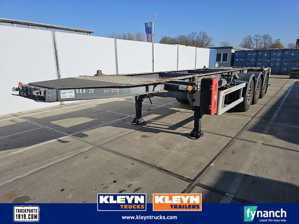 Aantal Assen: 3, Eigen gewicht: 3805 kg, Totaalgewicht: 39000 kg, Soort chassis: Volledig chassis, Materiaal chassis: staal, Kingpin afmeting: 2 inch, Lichtmetalen velgen, ABS (Anti Blokkeer Systeem), EBS, Bouwjaar opbouw: 2010, Twistlocks: 1x40, Merk as: SAF
