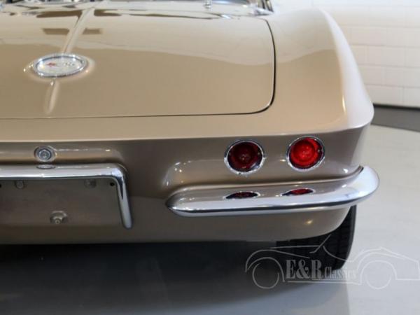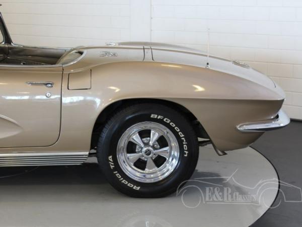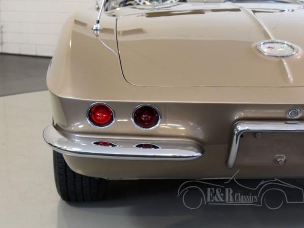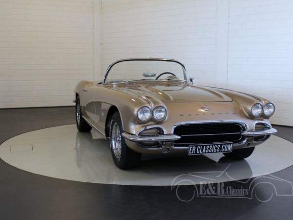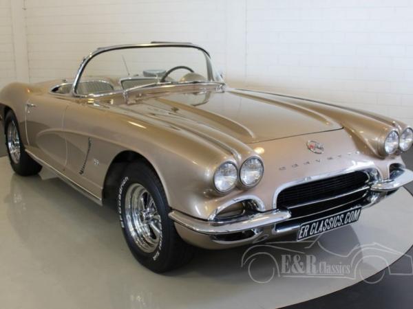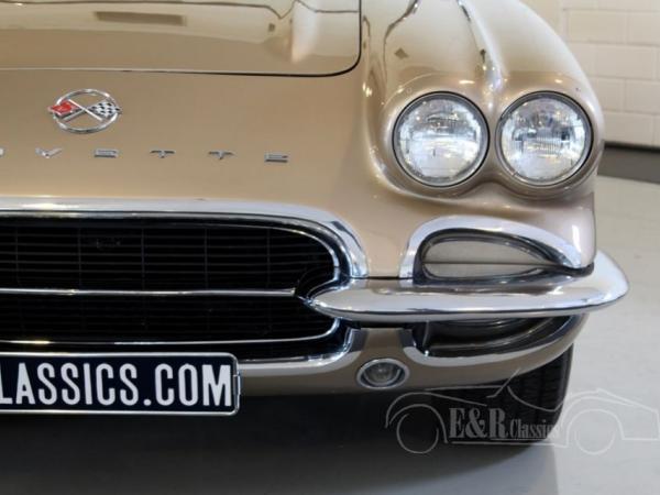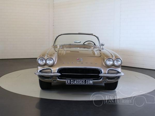 This is a 1962 Corvette C1 convertible. This original and rare colour Fawn Beige is beautiful in combination with the chrome wheels and white soft top. The interior is provided with leatherette and the original steering wheel. The V8 engine has a great sound and is easy to handle thanks to the 4 speed manual gearbox. So this is a beautiful and well maintained Corvette C1 cabriolet.