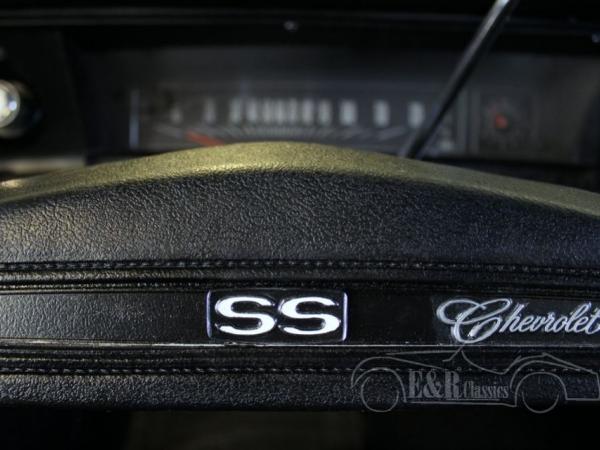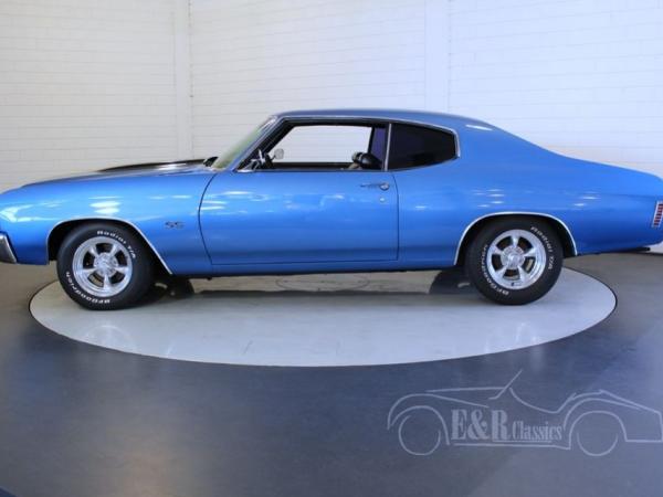 This beautiful Chevrolet was delivered in a deep blue metallic paint with black striping. The car also has new light metal wheels. The interior is provided with black leather and finished with several chrome details and a beautiful dashboard. The Chevelle has the original V8 engine and an automatic gearbox. Recently the engine was tuned up which makes the car drive great. The car also makes a great typical American sound.