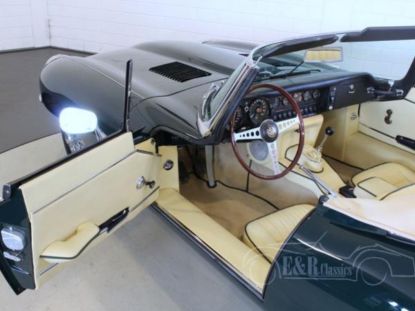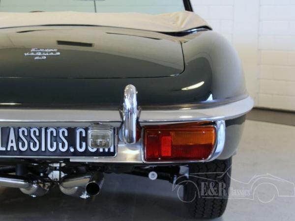 This really fabulous Jaguar E-Type Series 2 cabriolet is restored in 2017 and was provided with new paint in the colour British Racing Green, a very elegant combination with the completely new beige leather interior with green piping. The car has the original matching numbers, 6 cyl. Engine. Heritage Certificate is present and the full report of the restoration also. So a marvellous and perfect driving Jaguar E-Type Series 2 convertible.