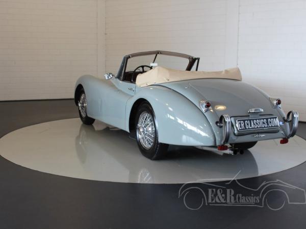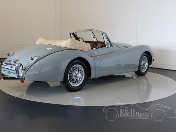 This is a marvellous 1954 Jaguar XK 120 Drop Head Coupe in the Special Equipment version with matching numbers engine. This Jaguar was fully restored in Holland. The car has paint in colour Birch Grey with burgundy red leather interior and a beige soft top. A fabulous combination on this iconic English classic car.