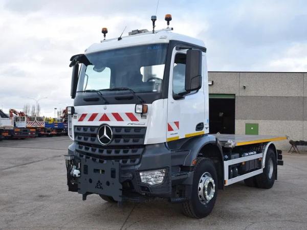 2dehands vrachtwagen Mercedes Arocs 1836 met platte bak – Slechts 32.000 km – inox Plateau +- 4.50 m – Sneeuwplaat – P.T.O aansluiting met Hydraulique ( motor of boite ) – Naafreductie – Airco – Camera – Bandenmaat 13R22.5 - total 19.000kg - tarra 8667 kg - tarra 3900 - wielbasis 3900 -