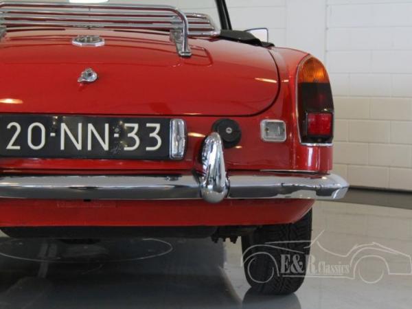 This MGB roadster was delivered in 1975 in beautiful Flame Red paint. The car has new chrome wire wheels and a marvelous luggagerack. The car drives great and has a revised gearbox with the popular overdrive option. The interior has black leatherette with comfortable seats and the original dashboard with chrome clocks. The MG is a perfect car for rides and is ready for lots of driving pleasure.