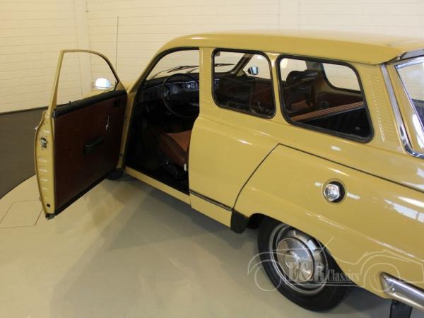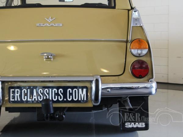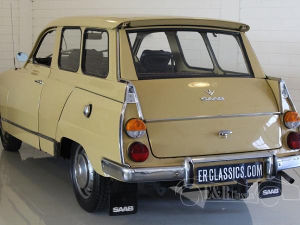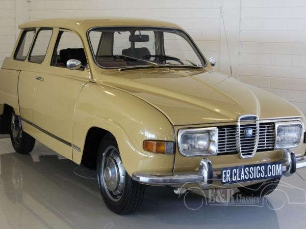 This Saab 95 Sporthatch was originally delivered in Holland in 1973 in beautiful beige (Y2) paint with several chrome details and the round taillights. The V4 engine was very well maintained and functions by the column shift. The interior has the original dashboard and the seat have brown leatherette and cloth upholstery. In the back there is the extra bench, so the car has 7 seats.