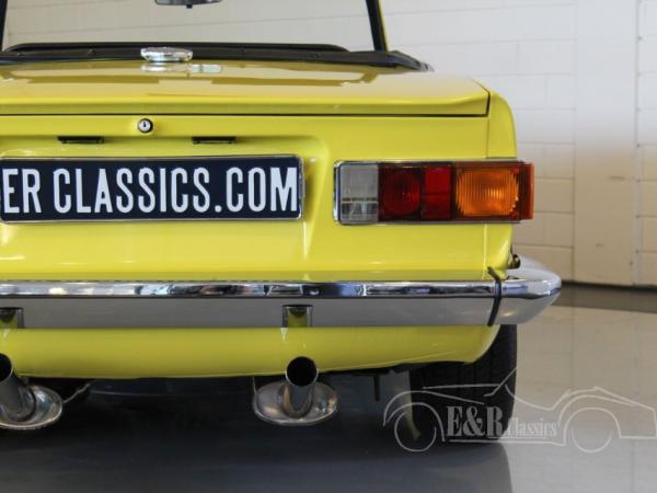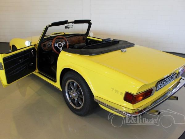 This Triumph TR6 is fully body-off restored and provided with the beautiful original Mimosa Yellow (64) paint. The TR6 has alloy wheels and a black soft top. The revised 2498 CC engine has 3 new Weber carburators and is connected to the manual gearbox with overdrive.