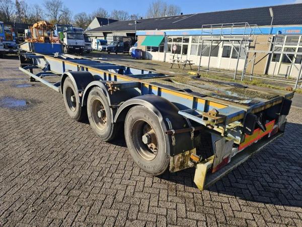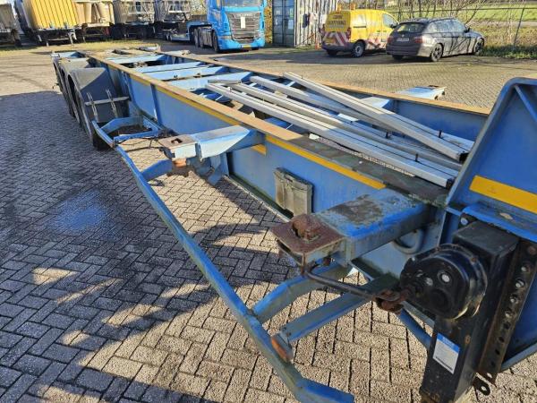 De oplegger is voorzien van 3 assen met luchtvering en trommelremmen, wat zorgt voor een stabiel en comfortabel rijgedrag. Ideaal voor het transport van 20FT containers.