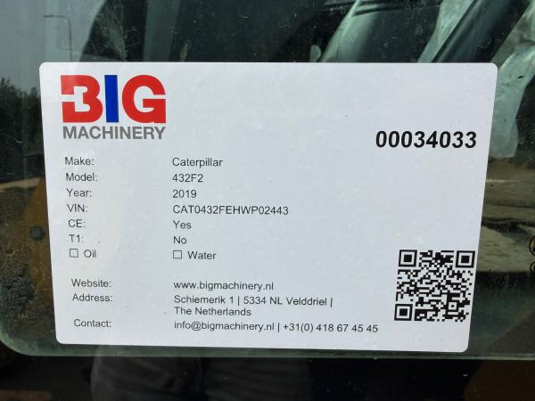 This Caterpillar 432F2 backhoe loader is available for sale at BIG Machinery in the Netherlands. Manufactured in the United Kingdom in 2019, the machine is CE certified and designed for versatile performance in construction and utility work.