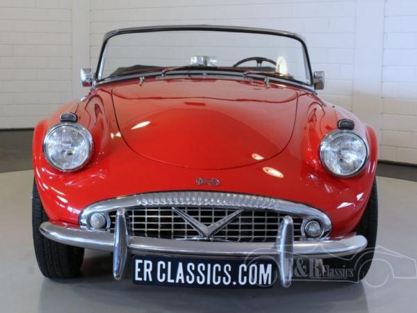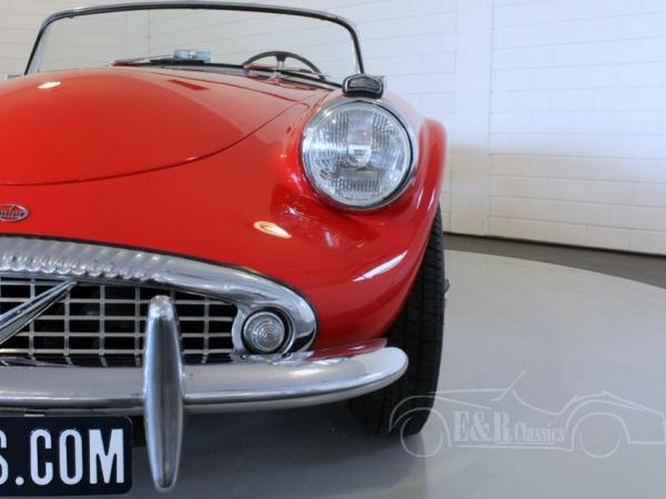 Very rare Daimler LHD SP 250, delivered in 1960 in a beautiful red paint and chrome wire wheels. The beautiful bucket seats and the dashboard have black leather and aluminium console with several clocks and switches. The Daimler has a great sound thanks to the 2499CC, V8 engine. Great to drive. This unique LHD Daimler drives perfect and is a real collectorsitem.