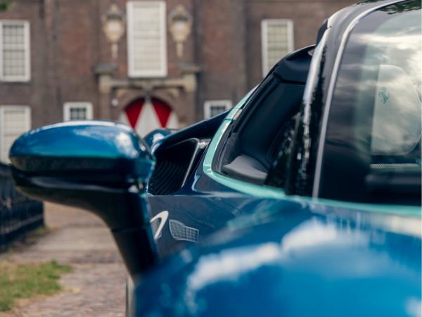 The Blu Capri 4-layer paint, unique to this model, is set off by a historic two-tone Nero roof (BIC2) and a hand-applied livery in Acquamarina Blu, racing across the bonnet, doors, and spoiler. A bold Bianco King circle on each door with the number 70 echoes Ferrari’s racing legacy, while the Italian and Dutch flag motifs at the door sills hint at the global passion Ferrari inspires.