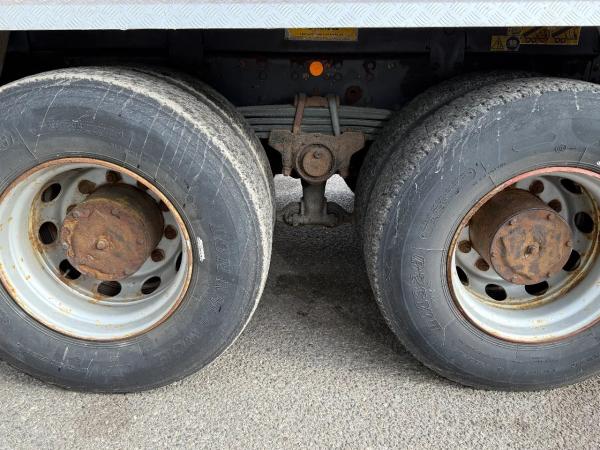 Achteras 2: Bandenmaat: 315/80R22.5; Dubbellucht; Differentieelslot; Max. aslast: 10500 kg; Bandenprofiel linksbinnen: 20%; Bandenprofiel linksbuiten: 20%; Bandenprofiel rechtsbinnen: 20%; Bandenprofiel rechtsbuiten: 20%; Reductie: naafreductie