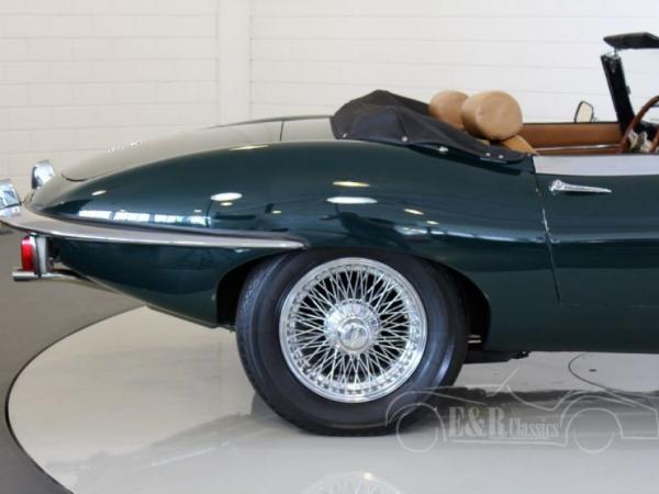 This Jaguar E-Type Series 2 cabriolet was built in 1969. In the meantime this Jaguar is restored and provided with a beautiful British Racing Green paint and fabulous chrome wire wheels. The Jaguar drives great and is powered by the original matching numbers 6 cyl engine. The interior of the Jaguar has beige leather and is very comfortable. The dashboard has the beautiful original wooden steering wheel. This fabulous E-Type drives great and is ready for lots of driving fun.