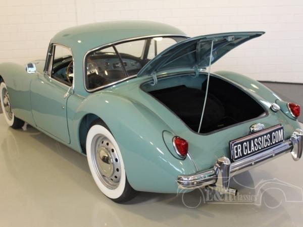 This is a 1959 MGA coupe. In 2016 this car was fully in detail body off restored and is in topcondition. Since then the car has driven only about 50 kms. Full photoreport of the restoration is present. The car has Island Green paint with black leather interior. This is a beautiful classic combination with the original wheels and Whitewall tyres. The 4 cyl engine is fully revised and connected to the 4-speed manual gearbox. So a rare beautiful MGA coupe, ready for driving.