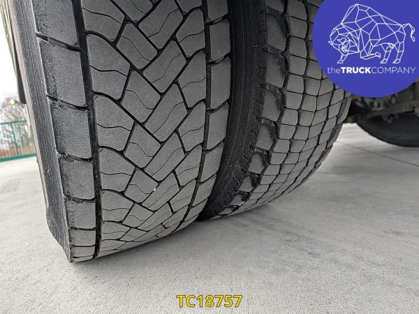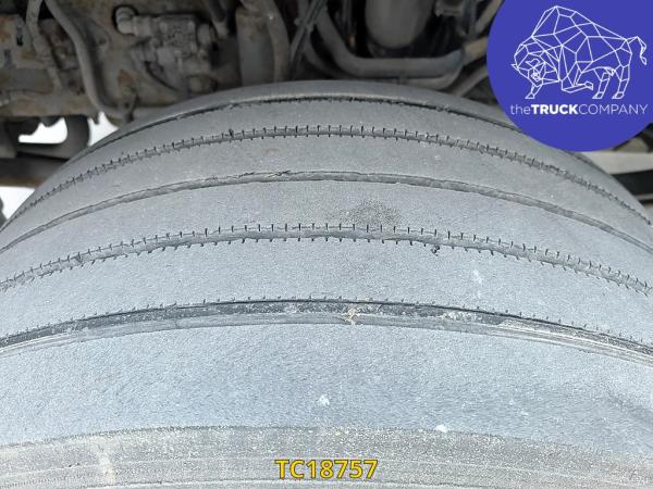 Achteras: Bandenmaat: 315/70 R22.5; Dubbellucht; Bandenprofiel linksbinnen: 14 mm; Bandenprofiel linksbuiten: 13 mm; Bandenprofiel rechtsbinnen: 13 mm; Bandenprofiel rechtsbuiten: 14 mm; Vering: luchtvering