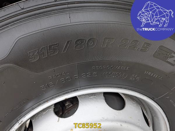 Vooras: Bandenmaat: 315/80 R22.5; Meesturend; Bandenprofiel links: 5 mm; Bandenprofiel rechts: 4 mm; Vering: bladvering