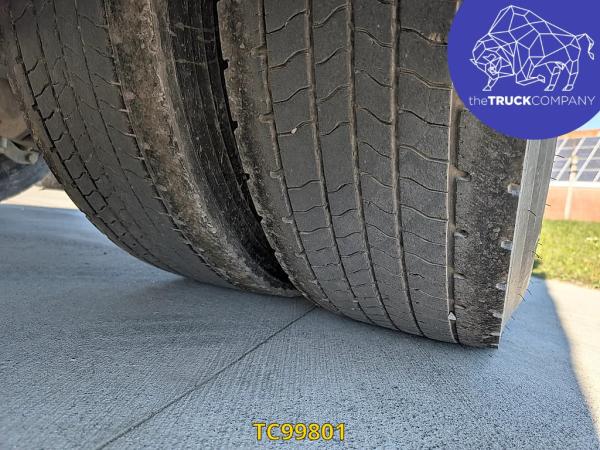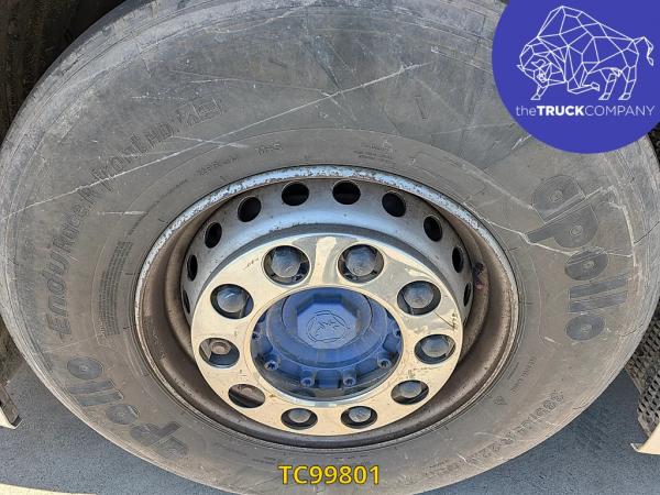 Achteras: Bandenmaat: 315/80 R22.5; Dubbellucht; Bandenprofiel linksbinnen: 3 mm; Bandenprofiel linksbuiten: 5 mm; Bandenprofiel rechtsbinnen: 2 mm; Bandenprofiel rechtsbuiten: 2 mm; Vering: luchtvering