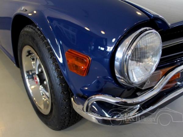 This marvellous Triumph TR6 was delivered with fabulous Sapphire Blue paint, a very nice combination with the chrome. The TR6 also has the original wheels with decorative rings. The softtop has dark blue cloth upholstery. This Triumph has the optional Overdrive which makes the car drive great. The Triumph has a beautiful interior with black leather and the original wooden dashboard. The seats have head-support which provides even more comfort. This Triunph is not only driving perfect, it also is a pleasure to see.
