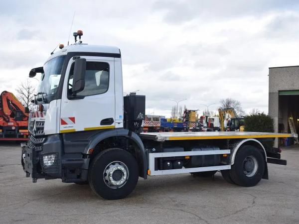 2dehands vrachtwagen Mercedes Arocs 1836 met platte bak – Slechts 32.000 km – inox Plateau +- 4.50 m – Sneeuwplaat – P.T.O aansluiting met Hydraulique ( motor of boite ) – Naafreductie – Airco – Camera – Bandenmaat 13R22.5 - total 19.000kg - tarra 8667 kg - tarra 3900 - wielbasis 3900 -
