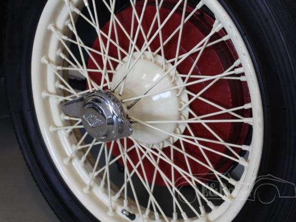 This is a 1934 Riley Kestrel in the Saloonversion. The car is in a very beautiful original condition with nice patina. The red paint is a great combination with the wire wheels in colour beige. The car has leather upholstery and the interior is finished with beautiful wood parts and ofcourse the fabulous big sunroof. In the front there is the famous ‘Nine Type engine’, a 4 cyl engine with double carburators. This is a very rare Saloon version.
