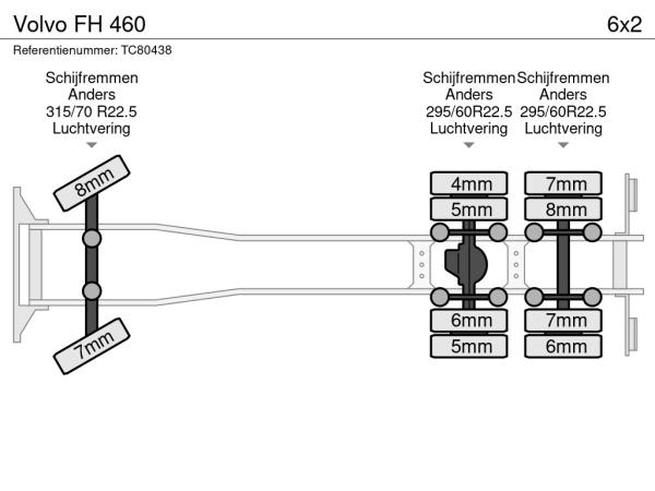 Achteras 2: Bandenmaat: 295/60R22.5; Dubbellucht; Bandenprofiel linksbinnen: 7 mm; Bandenprofiel linksbuiten: 6 mm; Bandenprofiel rechtsbinnen: 8 mm; Bandenprofiel rechtsbuiten: 7 mm